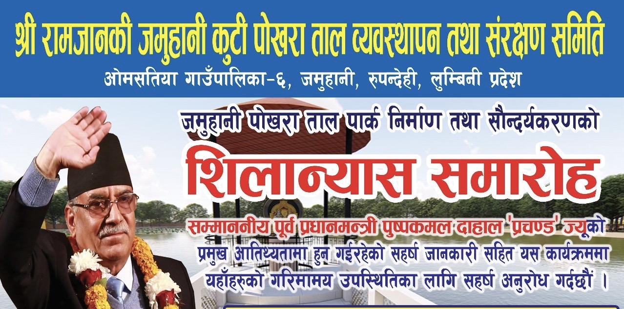 नेपाल कम्युनिष्ट पार्टी (माओवादी केन्द्र) का अध्यक्ष तथा पूर्वप्रधानमन्त्री पुष्पकमल दाहाल ‘प्रचण्ड’ले रुपन्देही जिल्लाको ओमसतियामा अवस्थित ऐतिहासिक तथा धार्मिक रामजानकी जमुहानी पोखरा ताल पार्कको शिलान्यासका लागी प्रचण्ड भोली ओमसतिया आउँदैछन।